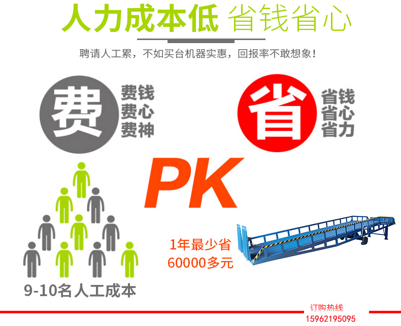 采用人工液壓動力,勿須外接動力電源即可輕松實現(xiàn)登車橋的高度調(diào)節(jié)。
