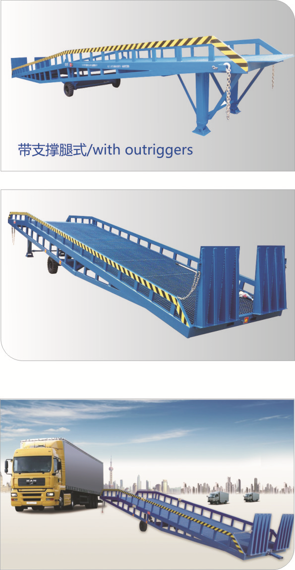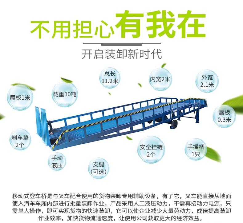 • 移動液壓登車橋是與叉車配合使用的貨物裝卸專用輔助設備,有了它,叉車能直接從地面進入汽車車廂內(nèi)進行裝卸貨物的作業(yè)。能夠提高貨物裝卸速度,節(jié)省裝卸工作的時間以及人力,是您裝卸貨物的得力助手。只需單人操作,不需動力電源,即可實現(xiàn)貨物的安全快速裝卸。移動式登車橋用于無裝卸設備的貨臺及流動裝卸場所,是與叉車配合使用的貨物裝卸輔助設備??筛鶕?jù)汽車車廂的高低調(diào)節(jié)高度,叉車可以直接通過本設備駛?cè)胲噹麅?nèi)部進行貨物的批量裝裝卸。
